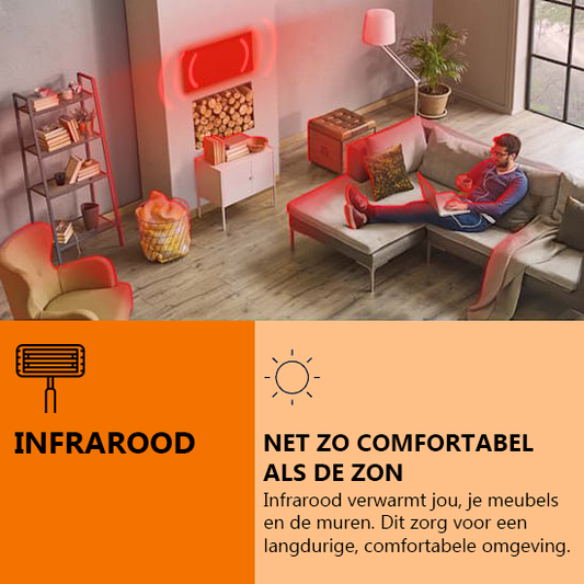 - Energiezuinig: Infraroodstraling verwarmt gericht en verbruikt hierdoor minder energie dan traditionele verwarmingssystemen.