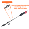De accu is krachtig en oplaadbaar, zodat u langdurig door kunt werken, terwijl het telescopische handvat in hoogte verstelbaar is voor maximale flexibiliteit en bereik. Dit maakt de takkenschaar geschikt voor zowel lage als hoge takken, zonder dat u hoeft te bukken of te reiken.